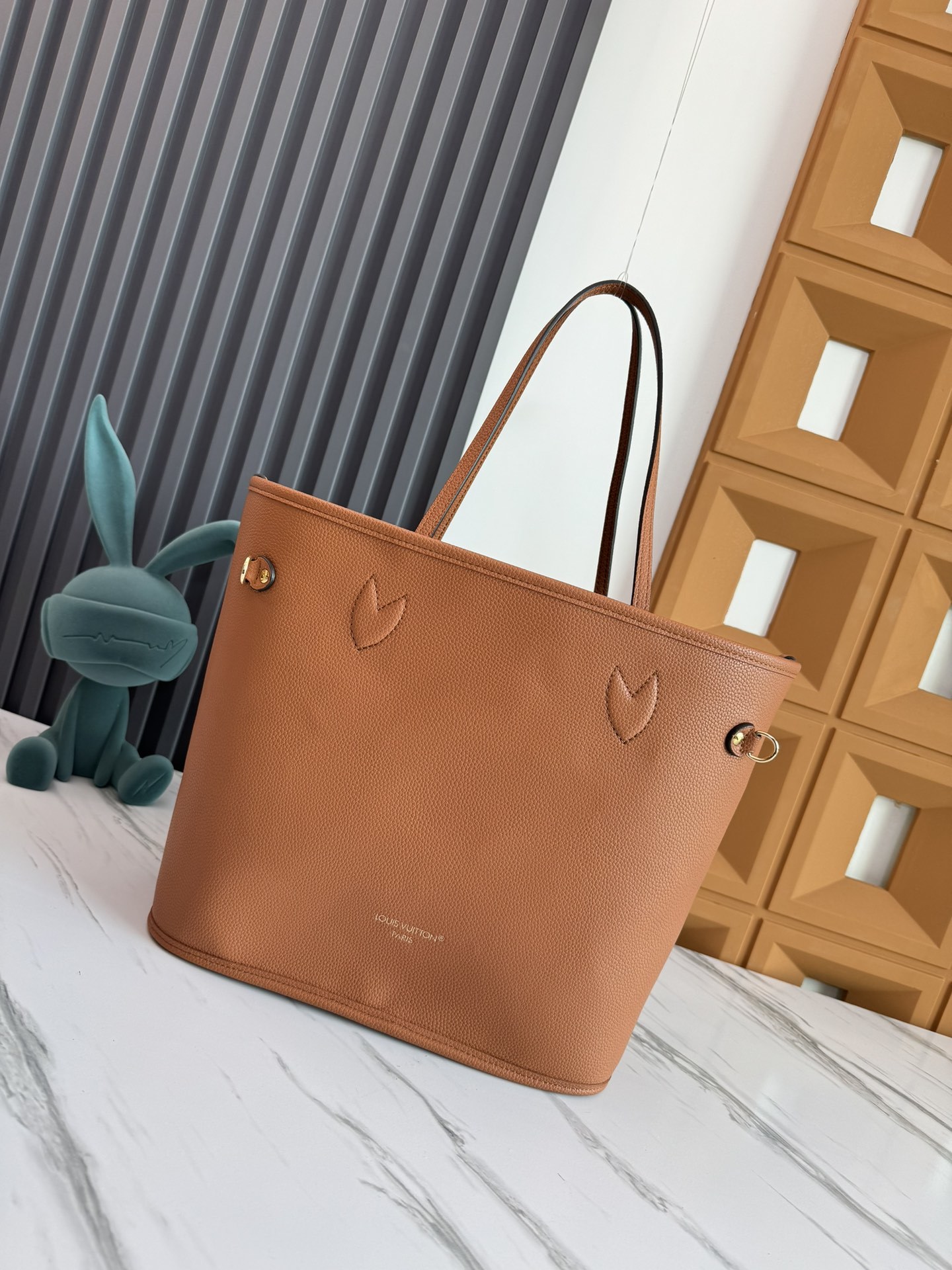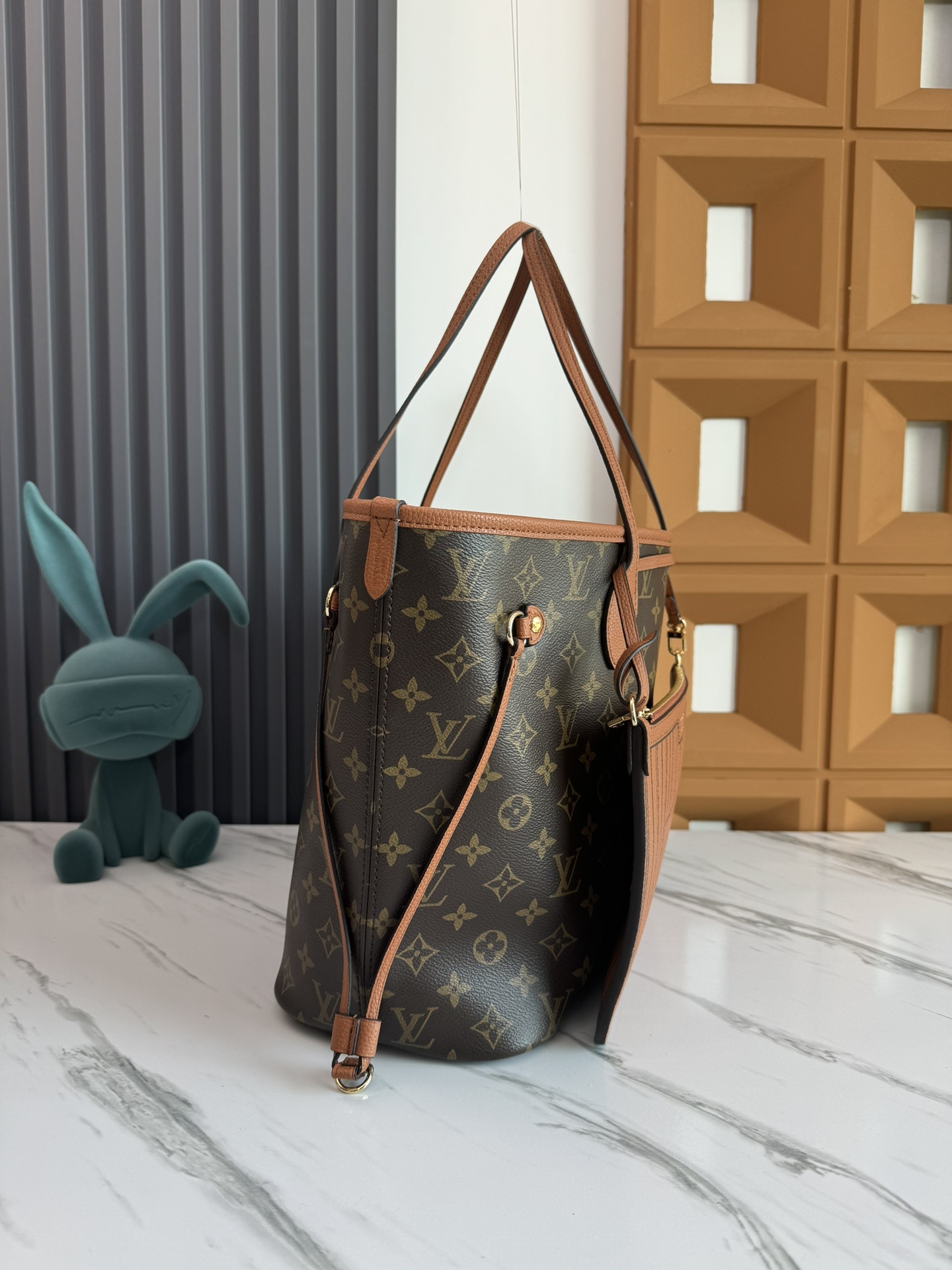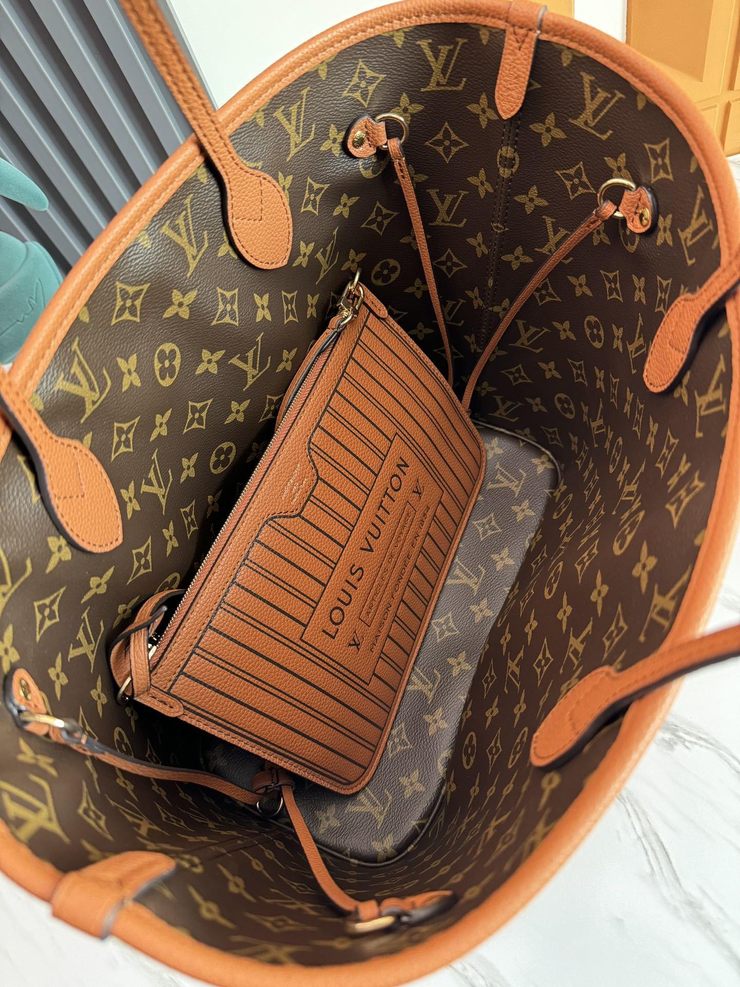 The M11946 black M12061 brown Neverfull Inside Out medium-sized handbag features a new double-sided design with Monogram canvas and grain leather. Its detachable pockets make it easy to transform into an outer bag or exquisite shoulder bag. 31 x 28 x 14 centimeters (length x height x width)