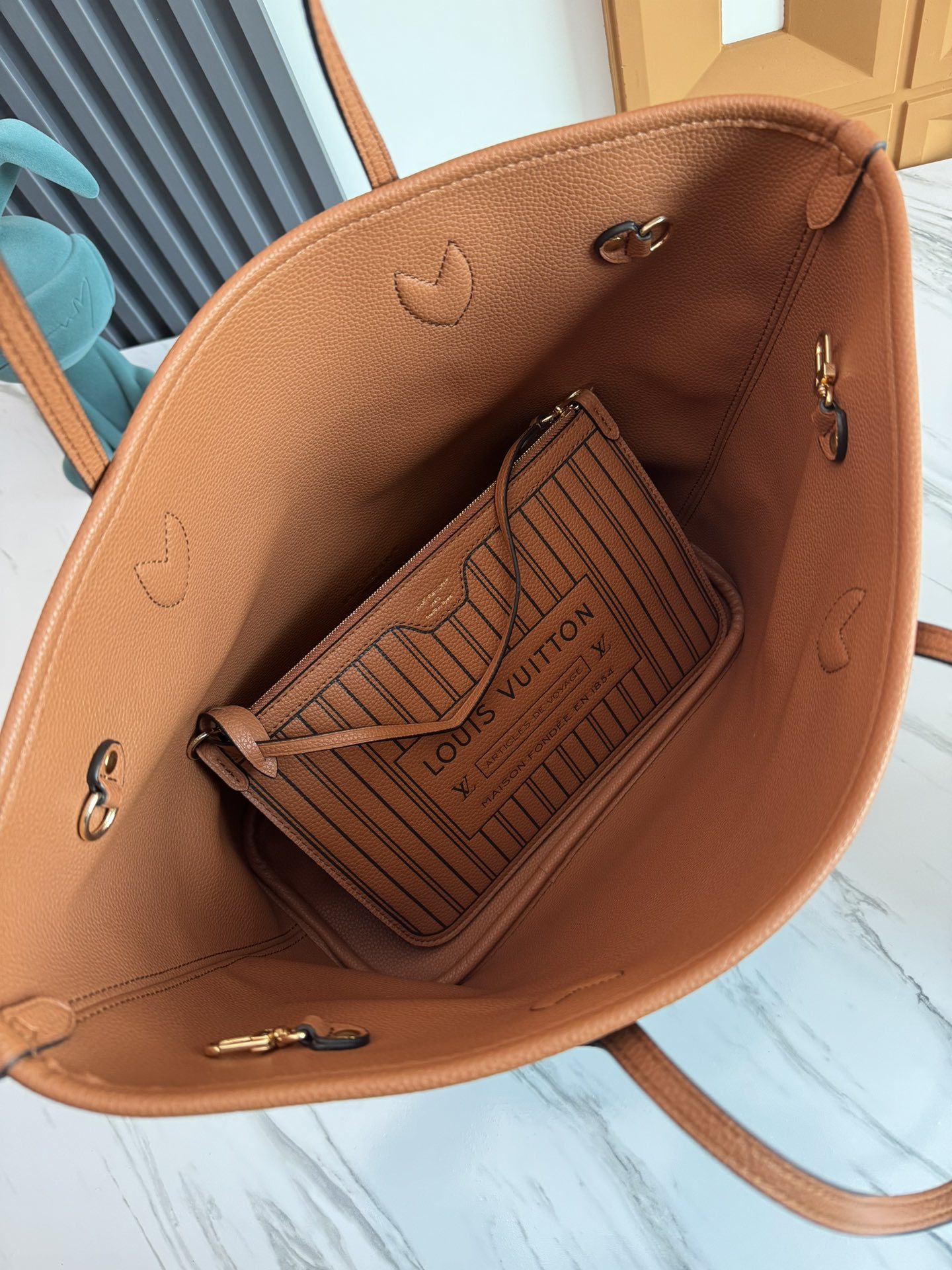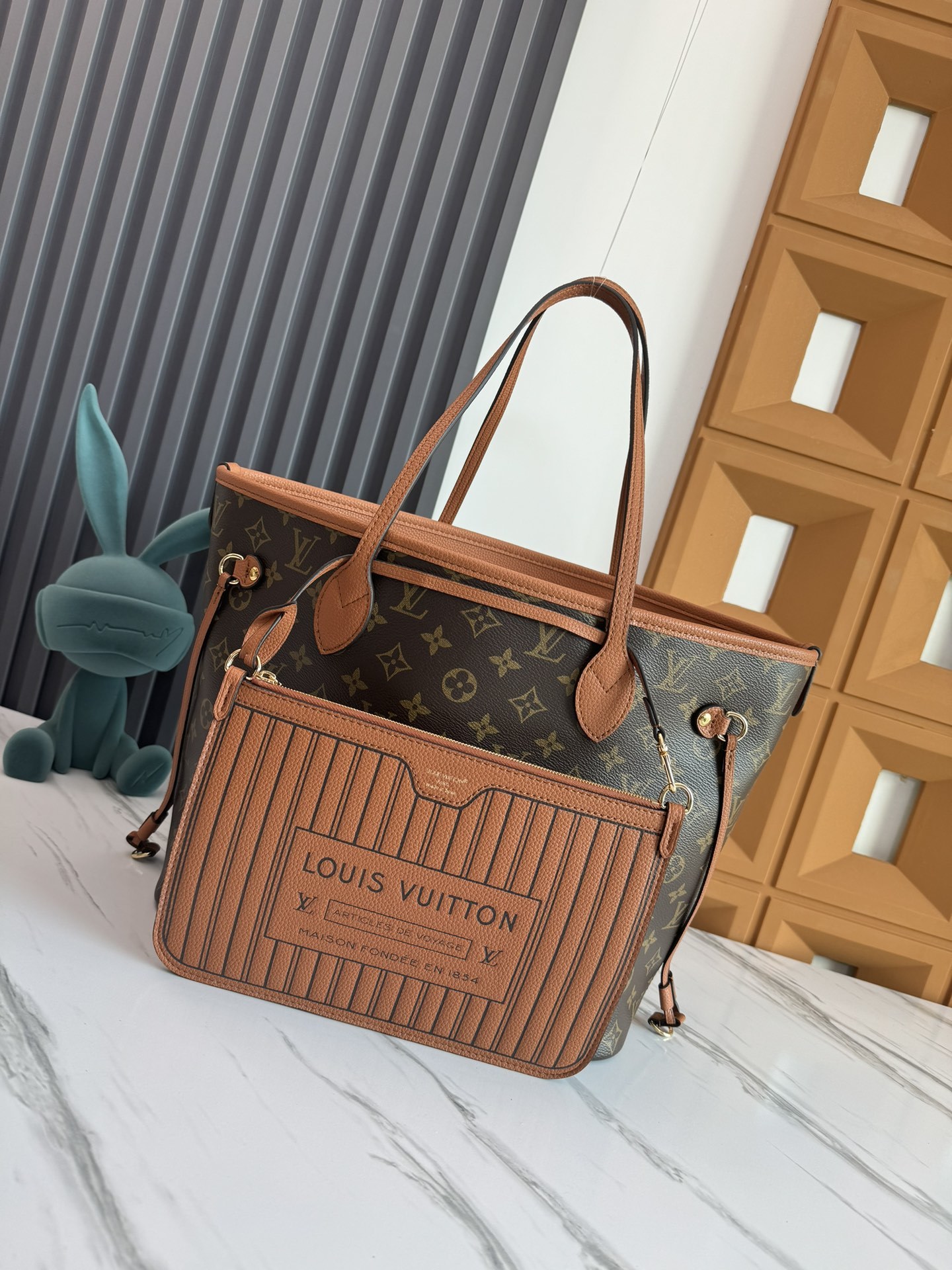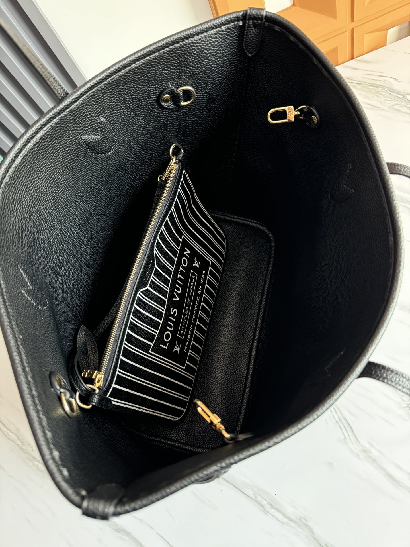 The M11946 black M12061 brown Neverfull Inside Out medium-sized handbag features a new double-sided design with Monogram canvas and grain leather. Its detachable pockets make it easy to transform into an outer bag or exquisite shoulder bag. 31 x 28 x 14 centimeters (length x height x width)